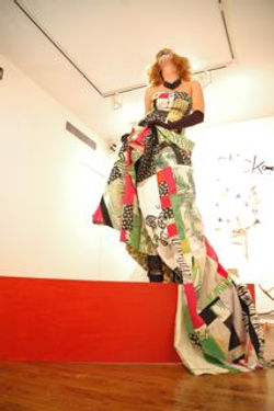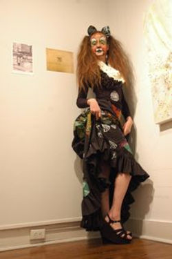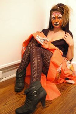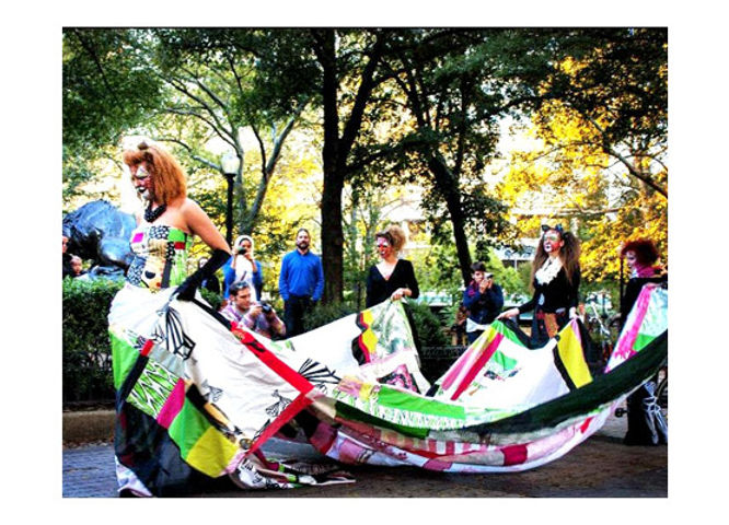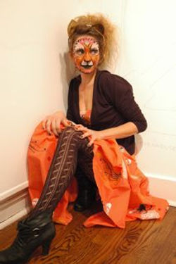 Meow! A public park central promenade became a fashion show runway for a moment. Resplendent of models adorned in one-of-a-kind garments full of bright hues, contrasting beautifully with that fall day's overcast sky. Perfectly painted into the likeness of tigers and kitty cats, models strutted their stuff: evening wear, leggings, capes, dresses and hoodies. Purring and hissing while unfurling the piece de resistance, a 30 yard patch worked skirt, the kitties turned the park into a mini outdoor paparazzi photo shoot for a quarter of an hour.